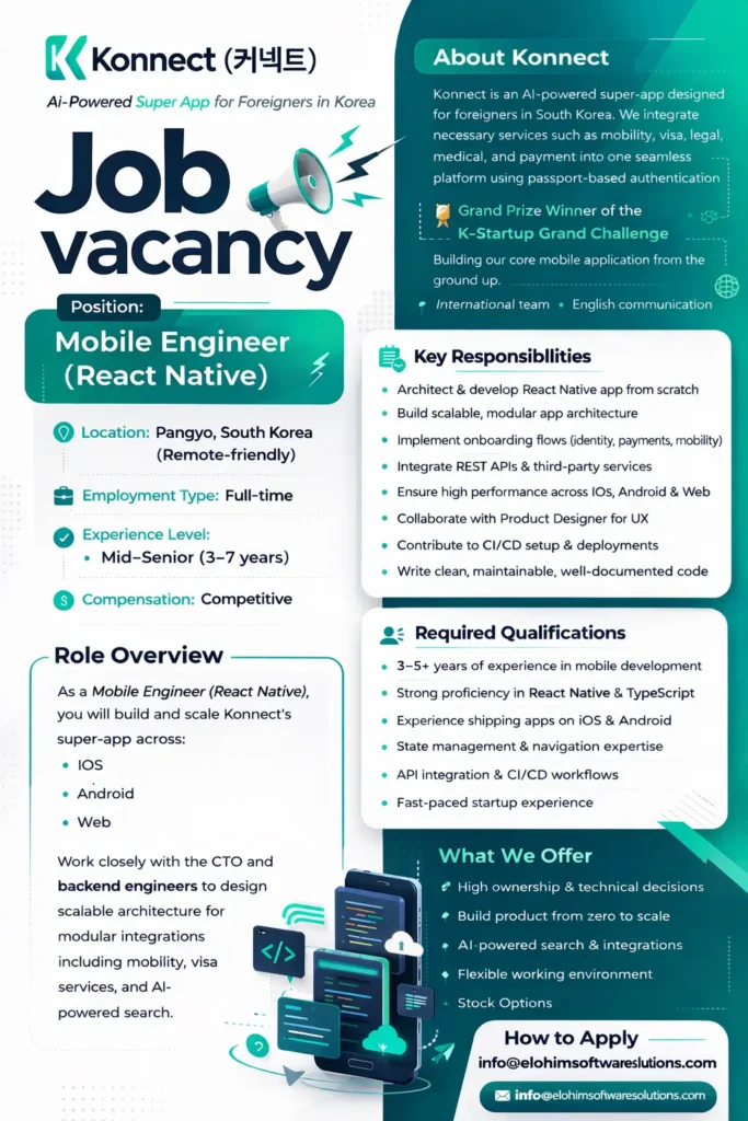 We are seeking a talented Mobile Engineer (React Native) to join our growing development team. In this role, you will be responsible for building and scaling a high-performance AI-powered super app designed to simplify essential services for foreigners in South Korea.